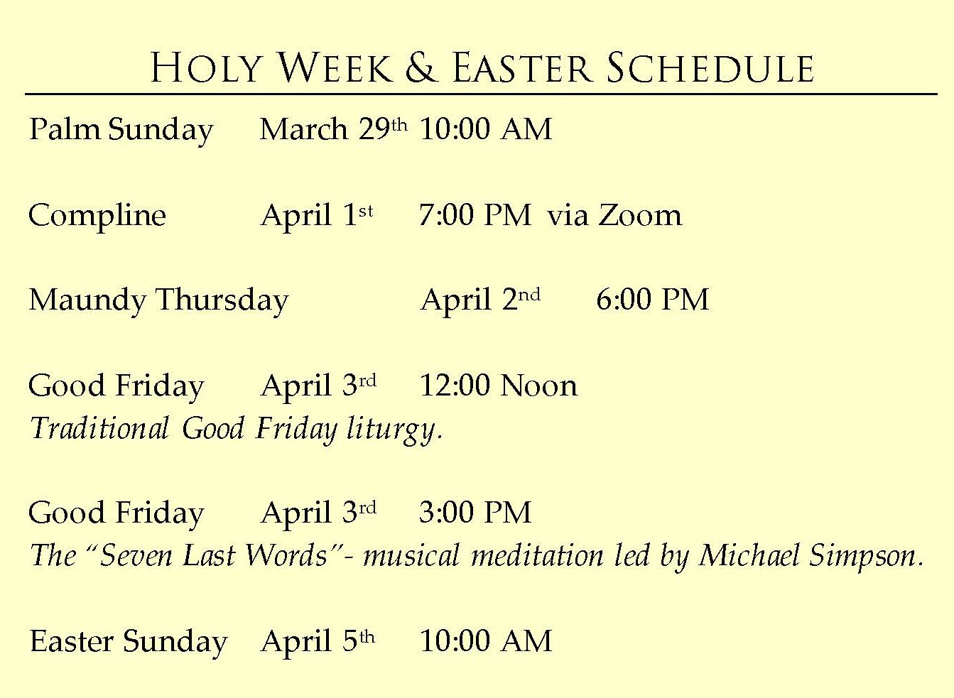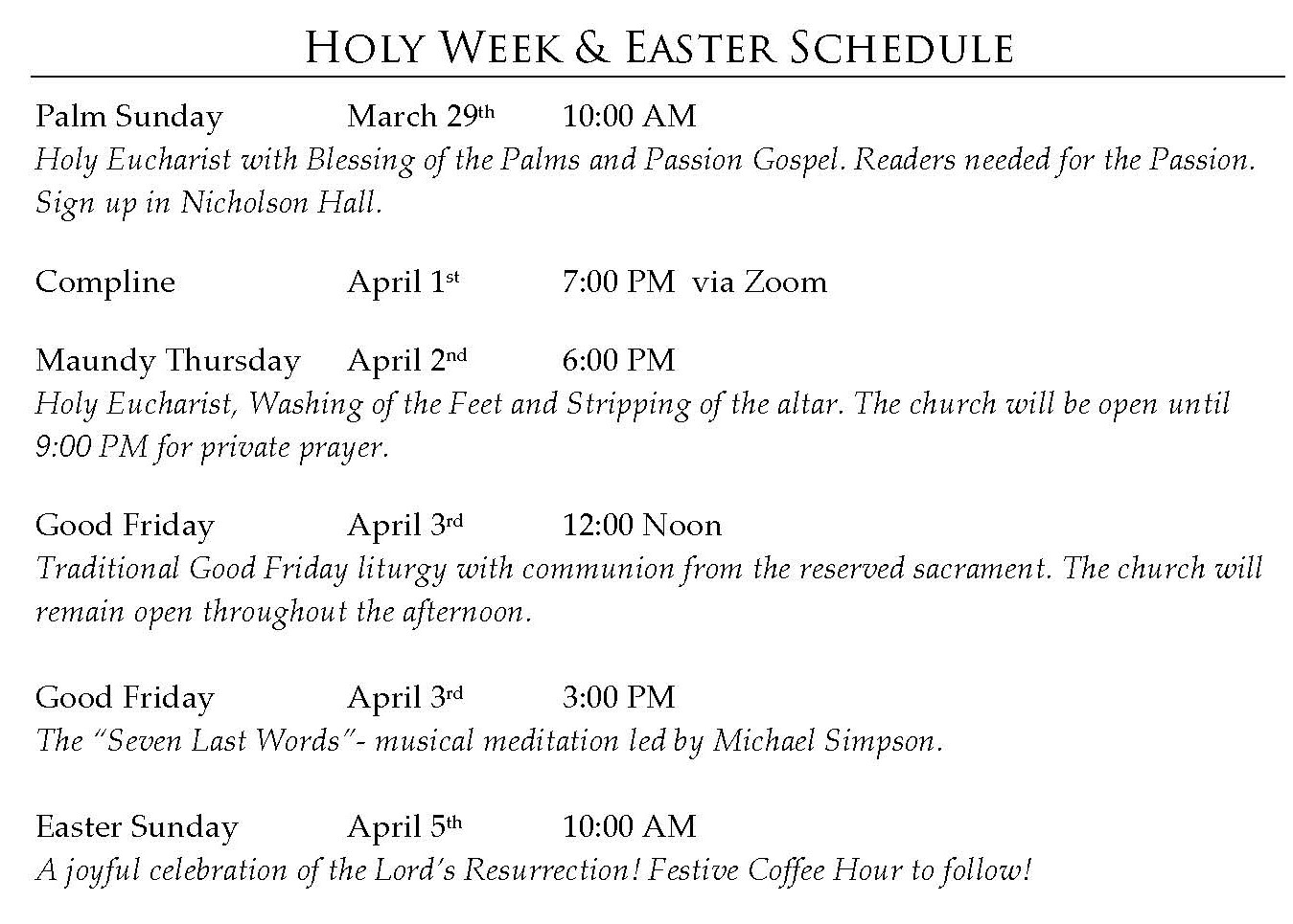 Easter & Holy WeekEaster Sunday, April 5th at 10:00 AM Festive Reception following! Worship Schedule Holy EucharistSunday @10:00AMCommunion, Sermon, Music, Healing Station and Coffee Hour Sunday Service Bulletin$Livestream Archives$ Strength for the JourneySaturday @8:30AM(June-October) Clergy & Vestry Calendar Outermost Voice – Weekly Newsletter